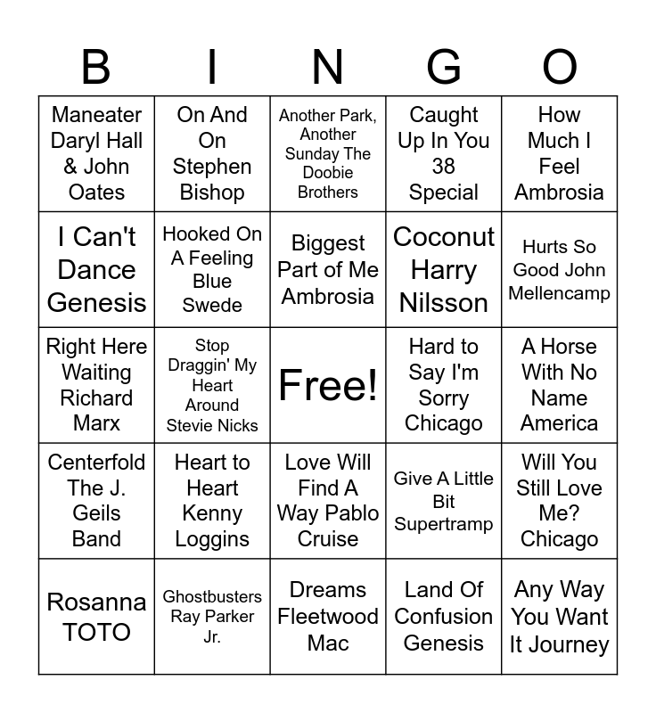 This bingo card has a free space and 165 words: Don't Stop Believin' Journey, Thank God I'm a Country Boy John Denver, This Is It Kenny Loggins, Broken Wings Mr. Mister, Hungry Eyes Eric Carmen, Don't Stand So Close To Me The Police, Lonesome Loser Little River Band, Waiting for a Girl like You Foreigner, It Keeps You Runnin 'The Doobie Brothers, Making Love Out of Nothing at All Air Supply, Turn It On Again Genesis, September Earth, Wind & Fire, Caught Up In You 38 Special, Peace of Mind Boston, Will You Still Love Me? Chicago, Don't Bring Me Down Electric Light Orchestra, FM Steely Dan, Invisible Touch Genesis, Two Tickets to Paradise Eddie Money, Keep on Loving You REO Speedwagon, Stuck In The Middle With You Stealers Wheel, Whenever I Call You "Friend" Kenny Loggins, The Way It Is Bruce Hornsby, How Long Ace, Whatcha Gonna Do? Pablo Cruise, We Built This City Starship, You Can Call Me Al Paul Simon, Arthur's Theme Christopher Cross, Hold the Line TOTO, Mexico James Taylor, Everybody Wants To Rule The World Tears For Fears, It's Still Rock and Roll to Me Billy Joel, Sussudio Phil Collins, Hold On Santana, Rosanna TOTO, The Things We Do For Love 10cc, Everywhere Fleetwood Mac, Your Love The Outfield, Take The Long Way Home Supertramp, Do That To Me One More Time Captain & Tennille, Do It Again Steely Dan, Escape Rupert Holmes, Centerfold The J. Geils Band, She's Gone Daryl Hall & John Oates, Jane Jefferson Starship, Thank You for Being a Friend Andrew Gold, Footloose Kenny Loggins, Cool Change Little River Band, Any Way You Want It Journey, Brown Eyed Girl Van Morrison, Minute by Minute The Doobie Brothers, All Out of Love Air Supply, Reelin' In The Years Steely Dan, This Must Be the Place Talking Heads, Sister Christian Night Ranger, How Much I Feel Ambrosia, Don't Go Breaking My Heart Elton John, Drift Away Dobie Gray, Takin' It to the Streets The Doobie Brothers, Careless Whisper George Michael, Take Me Home Tonight Eddie Money, Fly Like An Eagle Steve Miller Band, Sailing Christopher Cross, Coconut Harry Nilsson, Landslide Fleetwood Mac, Give A Little Bit Supertramp, Maneater Daryl Hall & John Oates, Feel Like Makin' Love Bad Company, Every Breath You Take The Police, Hurts So Good John Mellencamp, Sausalito Summernight Diesel, Can't Fight This Feeling REO Speedwagon, The Boys Of Summer Don Henley, True Spandau Ballet, She's Like the Wind Patrick Swayze, Still the One Orleans, The Joker Steve Miller Band, Ride Like the Wind Christopher Cross, All Night Long Lionel Richie, Jessie's Girl Rick Springfield, Burning Heart Survivor, Easy Lover Philip Bailey, Gold John Stewart, I'd Really Love to See You Tonight England Dan & John Ford Coley, Who Can It Be Now? Men At Work, Is This Love Survivor, Just the Two of Us Grover Washington, Jr., Another Park, Another Sunday The Doobie Brothers, Every Little Thing She Does Is Magic The Police, Life's Been Good Joe Walsh, I'm Alright Kenny Loggins, On the Border Al Stewart, Magnet and Steel Walter Egan, Higher Love Steve Winwood, Hard Habit to Break Chicago, Fooled Around And Fell In Love Elvin Bishop, Tequila Sunrise Eagles, 867-5309 / Jenny Tommy Tutone, On And On Stephen Bishop, High on You Survivor, New Kid in Town Eagles, Lovin', Touchin', Squeezin' Journey, Heart to Heart Kenny Loggins, Go Your Own Way Fleetwood Mac, Poetry Man Phoebe Snow, Deacon Blues Steely Dan, Hey Nineteen Steely Dan, Hold On Loosely 38 Special, Ghostbusters Ray Parker Jr., Summer Breeze Seals and Crofts, Make It with You Bread, Right Here Waiting Richard Marx, Reminiscing Little River Band, Rocky Mountain High John Denver, Open Arms Journey, I Just Wanna Stop Gino Vannelli, Sara Smile Daryl Hall & John Oates, I Can't Dance Genesis, Long Train Runnin' The Doobie Brothers, Get Outta My Dreams, Get into My Car Billy Ocean, You Make My Dreams Daryl Hall & John Oates, Goodbye Stranger Supertramp, I Want to Know What Love Is Foreigner, Working for the Weekend Loverboy, Peg Steely Dan, Jack & Diane John Mellencamp, Time Passages Al Stewart, Take It Easy Eagles, Addicted To Love Robert Palmer, Be Thankful for What You've Got William DeVaughn, Lowdown Boz Scaggs, Come Sail Away Styx, Dust in the Wind Kansas, Lido Shuffle Boz Scaggs, Hard to Say I'm Sorry Chicago, Baker Street Gerry Rafferty, Gypsy Fleetwood Mac, Take It On the Run REO Speedwagon, Biggest Part of Me Ambrosia, Faithfully Journey, Oh Sherrie Steve Perry, Listen to the Music The Doobie Brothers, What a Fool Believes The Doobie Brothers, Lovely Day Bill Withers, Hooked On A Feeling Blue Swede, Kiss on My List Daryl Hall & John Oates, A Horse With No Name America, Back In Time Huey Lewis & The News, Died In Your Arms Cutting Crew, Dreams Fleetwood Mac, That's All Genesis, The Power Of Love Huey Lewis & The News, Stop Draggin' My Heart Around Stevie Nicks, While You See A Chance Steve Winwood, Cecilia Simon & Garfunkel, Steal Away Robbie Dupree, I Keep Forgettin' Michael McDonald, Africa TOTO, Baby Come Back Player, Love Will Find A Way Pablo Cruise, More Than a Feeling Boston, You're the Inspiration Chicago, Message In A Bottle The Police, Land Of Confusion Genesis and Somebody's Watching Me Rockwell.