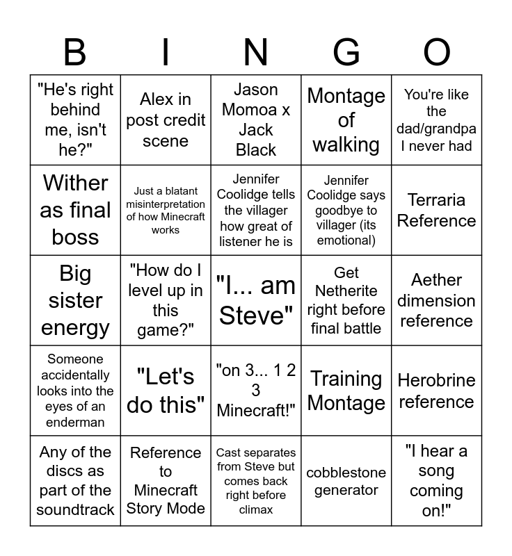 This bingo card has a free space and 24 words: "Let's do this", Reference to Minecraft Story Mode, Jennifer Coolidge tells the villager how great of listener he is, Any of the discs as part of the soundtrack, You're like the dad/grandpa I never had, "He's right behind me, isn't he?", Wither as final boss, Alex in post credit scene, Get Netherite right before final battle, "on 3... 1 2 3 Minecraft!", Jennifer Coolidge says goodbye to villager (its emotional), Big sister energy, Training Montage, Herobrine reference, Just a blatant misinterpretation of how Minecraft works, cobblestone generator, Aether dimension reference, Jason Momoa x Jack Black, Terraria Reference, "How do I level up in this game?", "I hear a song coming on!", Someone accidentally looks into the eyes of an enderman, Montage of walking and Cast separates from Steve but comes back right before climax.