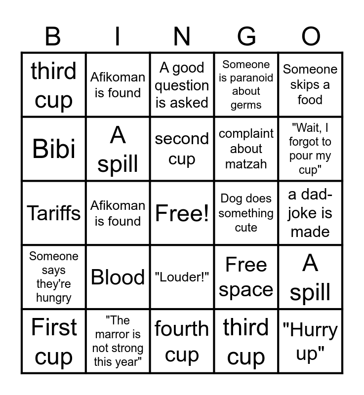 This bingo card has a free space and 55 words: A good question is asked, First cup, second cup, third cup, fourth cup, a "dad" joke is made, A spill, Hillel sandwich falls apart, complaint about matzah, complaint about temperature, Someone is paranoid about germs, Bibi callout, Tariffs, "Die" dayenu joke, Someone says they're hungry, Hands are washed, Someone skips a food, Afikoman is found, Dvar torah given, "Hurry up", Dog does something cute, Blood, Free space, A good question is asked, First cup, second cup, third cup, fourth cup, a dad-joke is made, A spill, Hillel sandwich falls apart, complaint about matzah, complaint about temperature, Someone is paranoid about germs, Bibi, Tariffs, "Die" dayenu joke, Someone says they're hungry, Hands are washed, someone skips a food, Afikoman is found, Dvar torah, Someone tries to speed through a section, Dog does something cute, Blood, "The marror is not strong this year", Something is thrown, Someone falls asleep, An off-color joke is made, "Wait, I forgot to pour my cup", "what page are we on?", "unprecedented times", "My hagadah has the order different", "Louder!" and Trivia game.