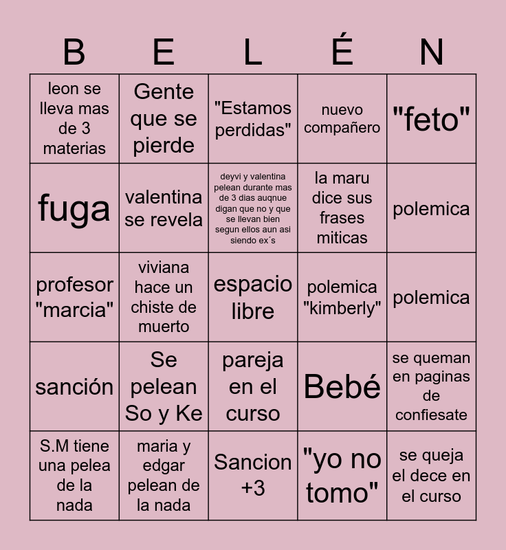 This bingo card has a free space and 24 words: Se pelean So y Ke, maria y edgar pelean de la nada, deyvi y valentina pelean durante mas de 3 dias auqnue digan que no y que se llevan bien segun ellos aun asi siendo ex´s, S.M tiene una pelea de la nada, "feto", leon se lleva mas de 3 materias, fuga, Gente que se pierde, polemica "kimberly", pareja en el curso, la maru dice sus frases miticas, profesor "marcia", Bebé, se queman en paginas de confiesate, valentina se revela, "yo no tomo", polemica, "Estamos perdidas", polemica, viviana hace un chiste de muerto, se queja el dece en el curso, sanción, nuevo compañero and Sancion +3.
