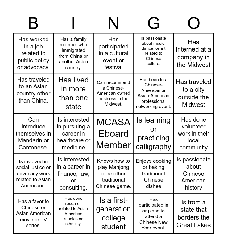 This bingo card has a free space and 31 words: Is a first-generation college student, Speaks more than one language, Is interested in pursuing a career in healthcare or medicine, Is from Chicago or another major Midwestern city, Has worked in a job related to public policy or advocacy., Has participated in a cultural event or festival, Has lived in more than one state, Enjoys cooking or baking traditional Chinese dishes, Is learning or practicing calligraphy, Has participated in or plans to attend a Chinese New Year event., Has done volunteer work in their local community, Is from a state that borders the Great Lakes, Has worked as a teaching assistant or research assistant at their university., Is involved in organizing cultural events or celebrations on campus., Has traveled to a city outside the Midwest, Is involved in a leadership role on campus, Is passionate about Chinese American history, Is interested in a career in finance, law, or consulting., Is involved in social justice or advocacy work related to Asian Americans., Knows how to play Mahjong or another traditional Chinese game., Has interned at a company in the Midwest, Has studied abroad or participated in a cultural exchange, Has a favorite Chinese or Asian American movie or TV series., Has a family member who immigrated from China or another Asian country., Has been to a Chinese-American or Asian-American professional networking event., Has traveled to an Asian country other than China., Is passionate about music, dance, or art related to Chinese culture., Can introduce themselves in Mandarin or Cantonese., Has done research related to Asian American studies or ethnicity., Can recommend a Chinese-American owned business in the Midwest. and Has visited the Midwest’s Chinatown areas (like in Chicago, Cleveland, or Detroit)..