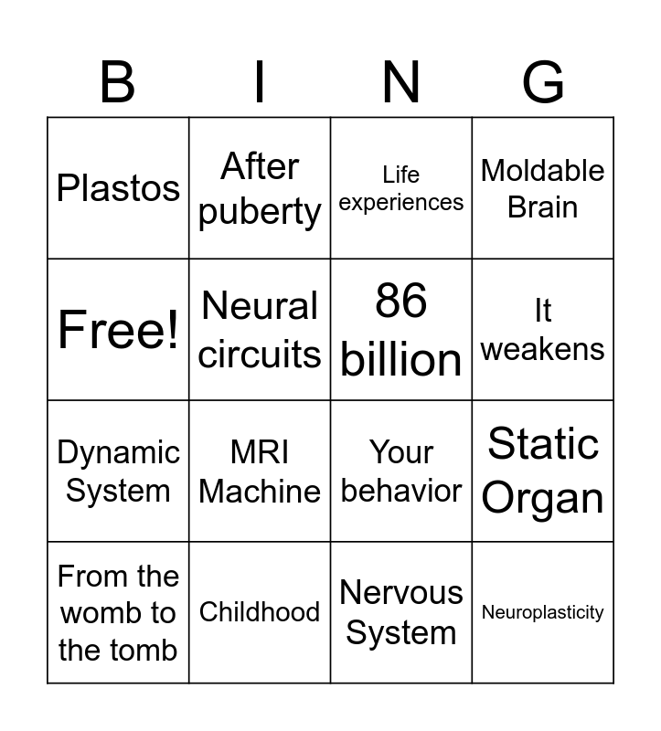 This bingo card has 16 words: Childhood, Static Organ, Life experiences, Plastos, Dynamic System, After puberty, Your behavior, Nervous System, Free!, Neural circuits, From the womb to the tomb, Moldable Brain, MRI Machine, It weakens, 86 billion and Neuroplasticity.