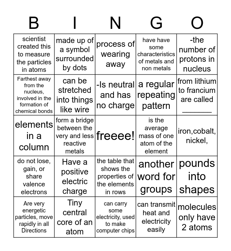 This bingo card has a free space and 24 words: Have a positive electric charge, Tiny central core of an atom, -Is neutral and has no charge, Are very energetic particles, move rapidly in all Directions, -the number of protons in nucleus, scientist created this to measure the particles in atoms, Farthest away from the nucleus, involved in the formation of chemical bonds, made up of a symbol surrounded by dots, is the average mass of one atom of the element, the table that shows the properties of the elements in rows, a regular repeating pattern, elements in a column, another word for groups, pounds into shapes, can be stretched into things like wire, can transmit heat and electricity easily, iron,cobalt, nickel,, process of wearing away, from lithium to francium are called _______, form a bridge between the very and less reactive metals, molecules only have 2 atoms, do not lose, gain, or share valence electrons, have have some characteristics of metals and non metals and can carry some electricity, used to make computer chips.