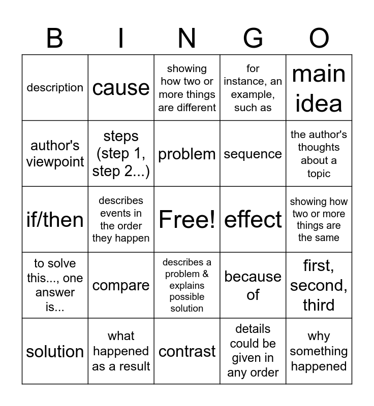 This bingo card has a free space and 25 words: compare, contrast, problem, solution, main idea, description, author's viewpoint, cause, effect, describes a problem & explains possible solution, sequence, if/then, because of, first, second, third, steps (step 1, step 2...), both, neither, showing how two or more things are the same, showing how two or more things are different, the author's thoughts about a topic, describes events in the order they happen, why something happened, what happened as a result, to solve this..., one answer is..., for instance, an example, such as and details could be given in any order.