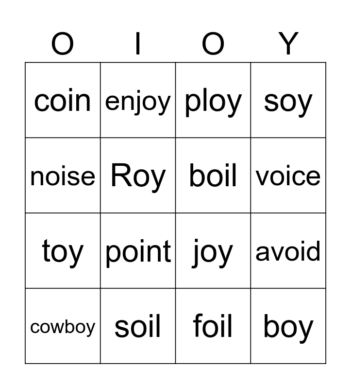 This bingo card has 16 words: cowboy, soil, ploy, soy, noise, enjoy, joy, avoid, coin, Roy, foil, voice, toy, point, boil and boy.