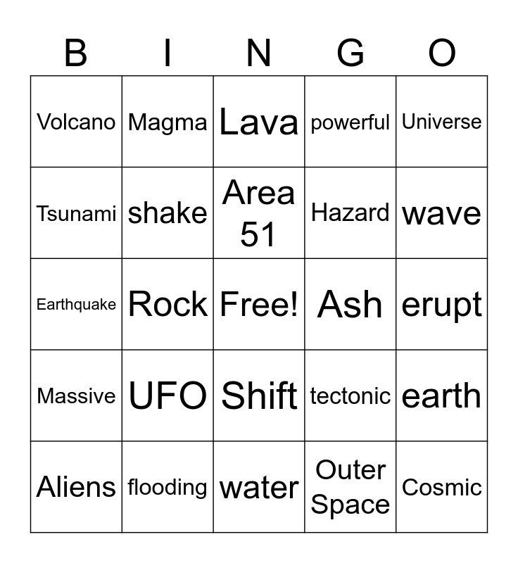 This bingo card has a free space and 24 words: Aliens, UFO, Area 51, Outer Space, Universe, Volcano, Magma, Lava, Ash, erupt, Earthquake, shake, tectonic, earth, Tsunami, flooding, water, powerful, wave, Massive, Rock, Shift, Hazard and Cosmic.