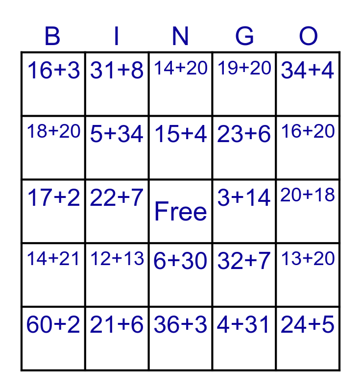 This bingo card has a free space and 24 words: 12+13, 21+6, 15+4, 60+2, 34+4, 16+3, 18+20, 31+8, 3+14, 6+30, 23+6, 17+2, 32+7, 13+20, 5+34, 4+31, 20+18, 14+20, 16+20, 22+7, 24+5, 14+21, 19+20 and 36+3.