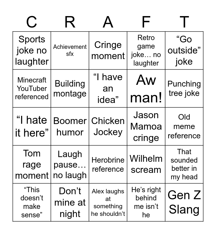 This bingo card has a free space and 24 words: Laugh pause… no laugh, Don’t mine at night, “I have an idea”, “This doesn’t make sense”, “Go outside” joke, Sports joke no laughter, Minecraft YouTuber referenced, Achievement sfx, Jason Mamoa cringe, Herobrine reference, Aw man!, “I hate it here”, Wilhelm scream, That sounded better in my head, Building montage, He’s right behind me isn’t he, Old meme reference, Cringe moment, Punching tree joke, Boomer humor, Gen Z Slang, Tom rage moment, Retro game joke… no laughter and Alex laughs at something he shouldn’t.