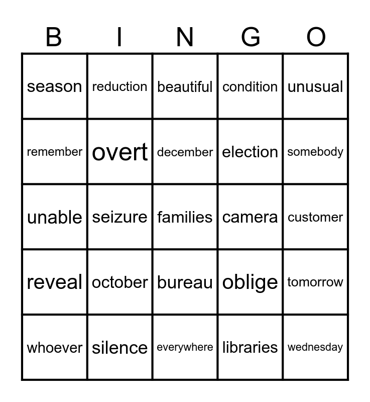 This bingo card has 30 words: silence, vital, seizure, vocal, season, beautiful, overt, bureau, camera, everywhere, customer, families, libraries, wednesday, somebody, imply, oblige, reveal, october, unusual, unable, erosion, reduction, election, remember, condition, tomorrow, whoever, december and november.