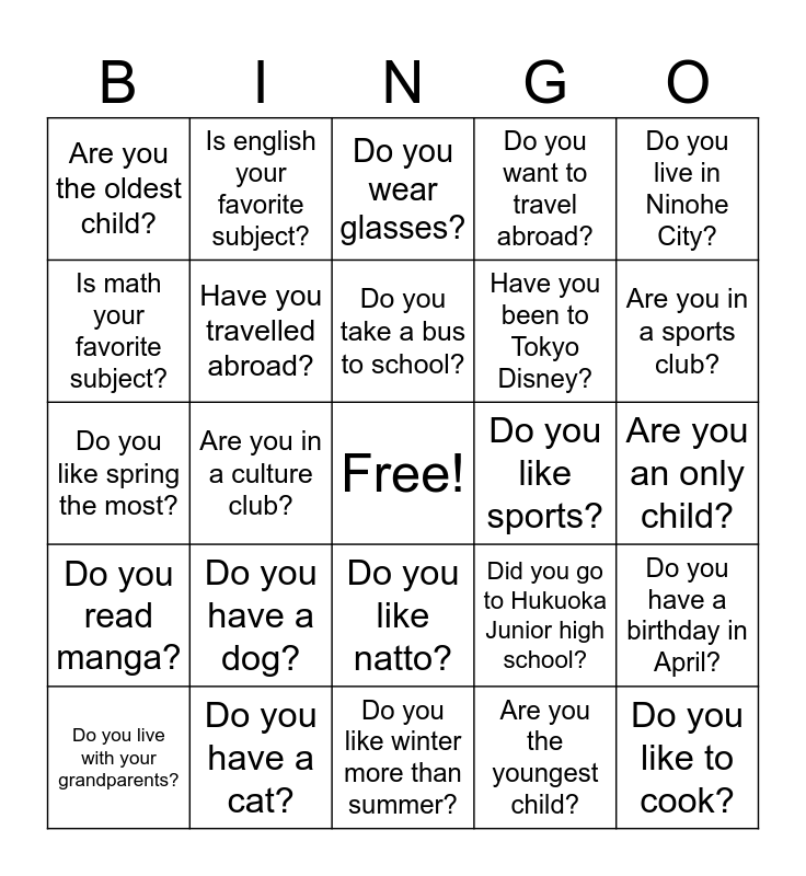 This bingo card has a free space and 24 words: Do you have a dog?, Do you have a cat?, Do you take a bus to school?, Do you live with your grandparents?, Do you live in Ninohe City?, Are you the oldest child?, Is math your favorite subject?, Is english your favorite subject?, Do you like sports?, Do you like natto?, Have you been to Tokyo Disney?, Do you like spring the most?, Did you go to Hukuoka Junior high school?, Do you have a birthday in April?, Have you travelled abroad?, Are you the youngest child?, Are you an only child?, Do you wear glasses?, Are you in a sports club?, Are you in a culture club?, Do you like to cook?, Do you read manga?, Do you want to travel abroad? and Do you like winter more than summer?.