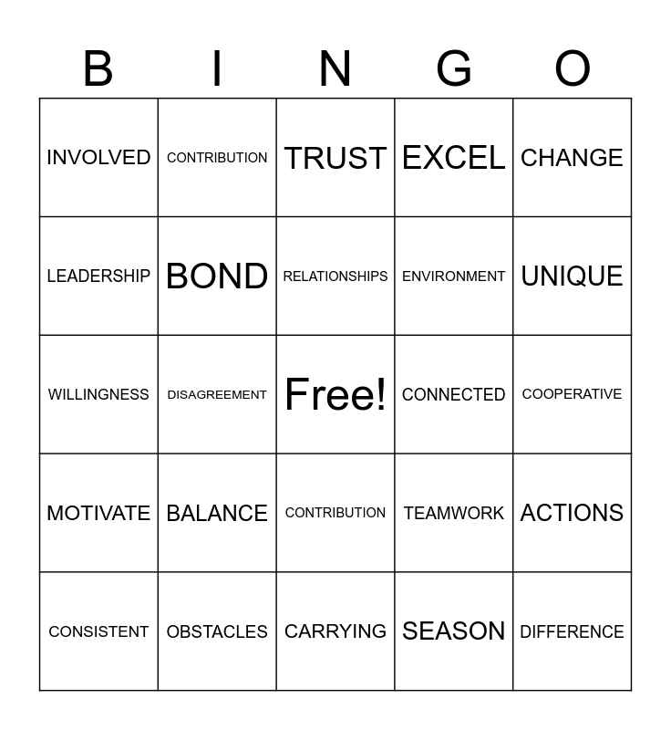 This bingo card has a free space and 59 words: CHALLENGES, OBSTACLES, CREATE, MOTIVATE, SEASON, UNBREAKABLE, BOND, PERFORMANCE, ENVIRONMENT, PERFORMANCE, EXCEL, GREATER, LEADERSHIP, UNITY, COMMITTED, INVOLVED, DIFFERENCE, CHANGE, COMMITMENT, RELATIONSHIPS, CONNECTED, TRUST, CONSISTENT, ACTIONS, VALUE, OFFER, ROLE, BUILD, UNIQUE, APPRECIATED, SUPPORT, STRENGHT, COMMUNICATION, RESPECTFUL, CONTRIBUTION, CONFLICT, OVERCOME, DISAGREEMENT, MISCOMMUNICATION, WILLINGNESS, SELFLESSNESS, BALANCE, COOPERATIVE, WORKLOAD, SUCCESS, ESSENTIAL, THREATEN, TABLE, CONTRIBUTION, CARRYING, CELEBRATING, TOGETHER, WE, I, OTHERS, TEAMWORK, OPEN, INCLUSION and OWNERSHIP.