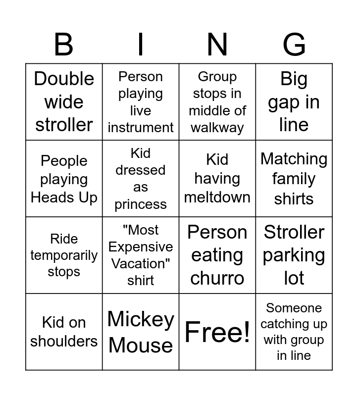 This bingo card has 17 words: Free!, Kid on shoulders, Group stops in middle of walkway, Double wide stroller, "Most Expensive Vacation" shirt, Big gap in line, Stroller parking lot, Kid having meltdown, Matching family shirts, Kid dressed as princess, Mickey Mouse, Person eating churro, People playing Heads Up, Person playing live instrument, Ride temporarily stops, Hidden Mickey and Someone catching up with group in line.