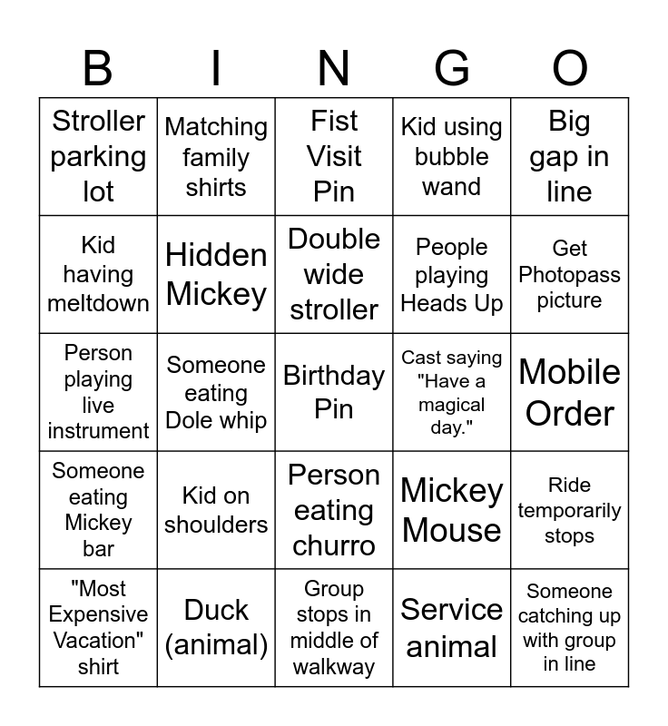 This bingo card has 25 words: Kid on shoulders, Group stops in middle of walkway, Double wide stroller, "Most Expensive Vacation" shirt, Big gap in line, Stroller parking lot, Kid having meltdown, Matching family shirts, Cast saying "Have a magical day.", Person eating churro, People playing Heads Up, Person playing live instrument, Mickey Mouse, Ride temporarily stops, Hidden Mickey, Someone catching up with group in line, Mobile Order, Fist Visit Pin, Get Photopass picture, Someone eating Dole whip, Birthday Pin, Duck (animal), Someone eating Mickey bar, Kid using bubble wand and Service animal.