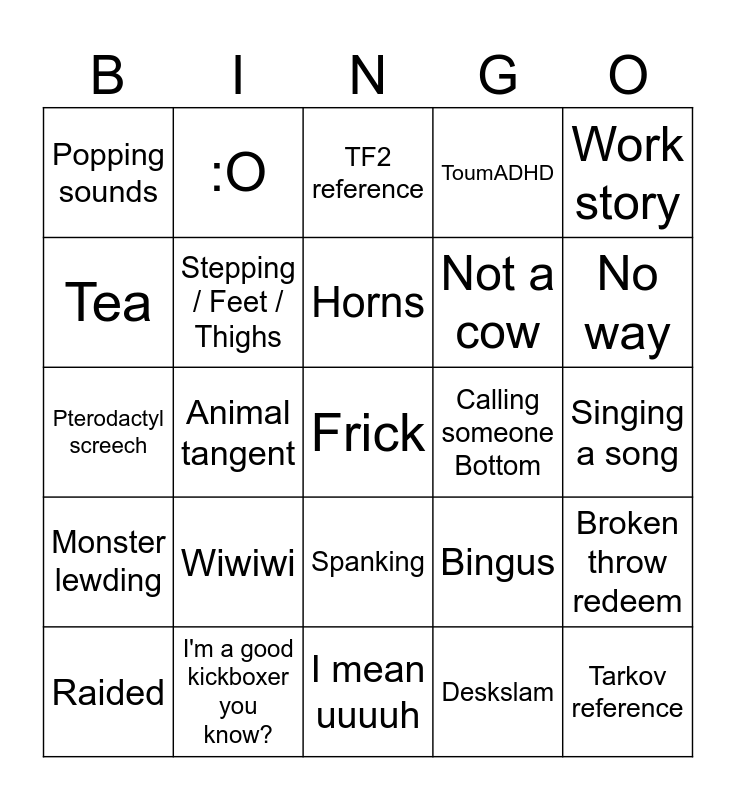 This bingo card has a free space and 24 words: Wiwiwi, I'm a good kickboxer you know?, Horns, Raided, Work story, Popping sounds, Tea, :O, Calling someone Bottom, Spanking, Not a cow, Pterodactyl screech, Bingus, Broken throw redeem, Stepping / Feet / Thighs, Deskslam, Singing a song, TF2 reference, No way, Animal tangent, Tarkov reference, Monster lewding, ToumADHD and I mean uuuuh.