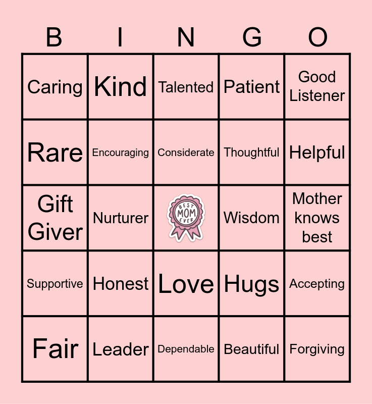 This bingo card has a free space and 24 words: Honest, Leader, Considerate, Fair, Good Listener, Caring, Rare, Kind, Wisdom, Love, Thoughtful, Gift Giver, Hugs, Accepting, Encouraging, Beautiful, Mother knows best, Talented, Helpful, Nurturer, Forgiving, Supportive, Patient and Dependable.