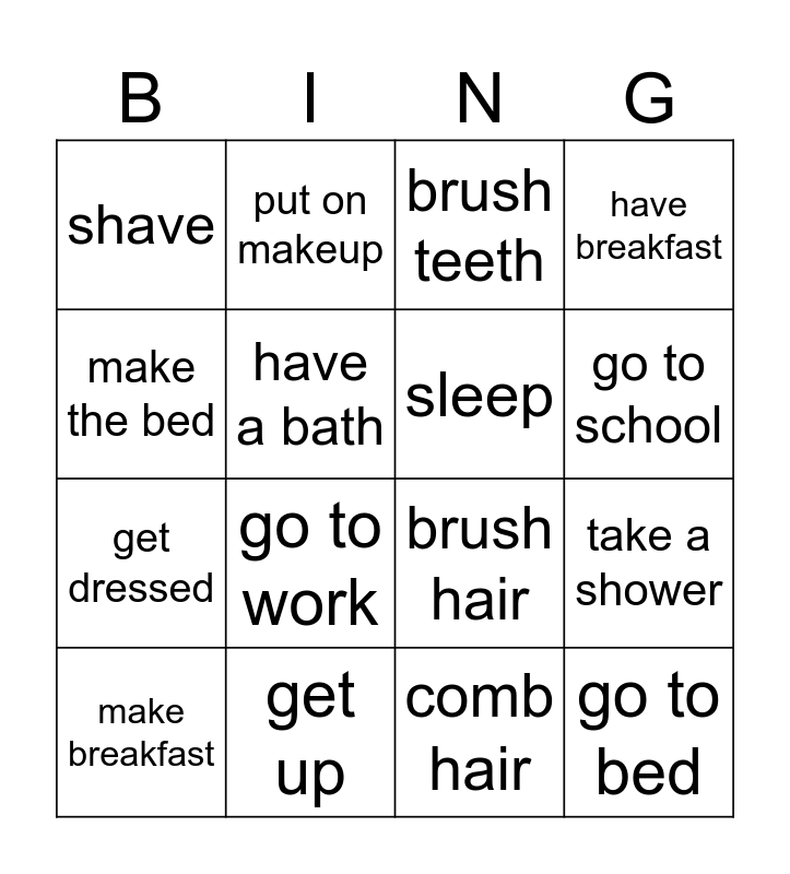 This bingo card has 16 words: get up, take a shower, brush teeth, shave, get dressed, put on makeup, brush hair, comb hair, make the bed, have a bath, make breakfast, have breakfast, go to work, go to school, sleep and go to bed.