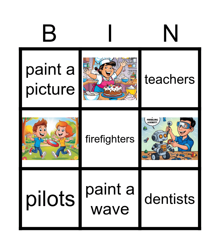 This bingo card has 3 images, a free space and 5 words: teachers, pilots, paint a picture, dentists and paint a wave.