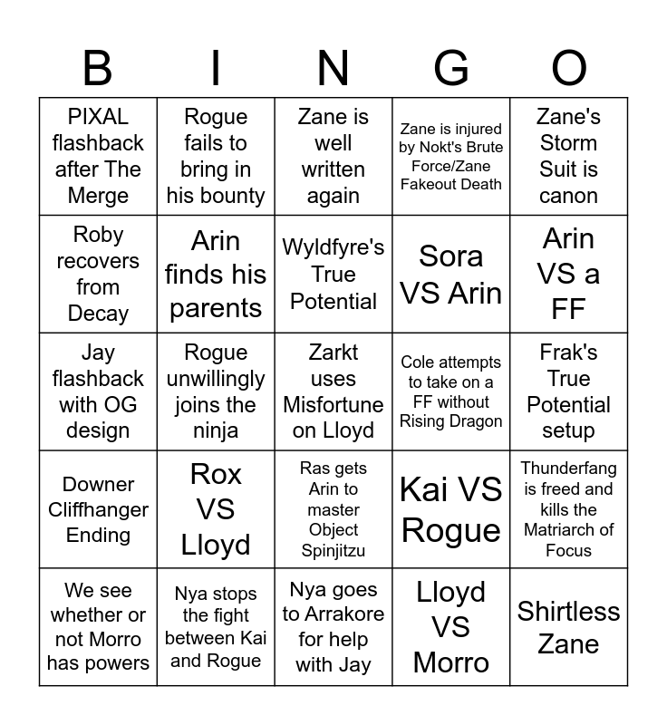 This bingo card has 25 words: Rox VS Lloyd, Nya goes to Arrakore for help with Jay, Wyldfyre's True Potential, We see whether or not Morro has powers, Zane's Storm Suit is canon, PIXAL flashback after The Merge, Roby recovers from Decay, Rogue fails to bring in his bounty, Cole attempts to take on a FF without Rising Dragon, Ras gets Arin to master Object Spinjitzu, Sora VS Arin, Jay flashback with OG design, Kai VS Rogue, Thunderfang is freed and kills the Matriarch of Focus, Arin finds his parents, Shirtless Zane, Frak's True Potential setup, Zane is well written again, Arin VS a FF, Rogue unwillingly joins the ninja, Zarkt uses Misfortune on Lloyd, Nya stops the fight between Kai and Rogue, Downer Cliffhanger Ending, Zane is injured by Nokt's Brute Force/Zane Fakeout Death and Lloyd VS Morro.