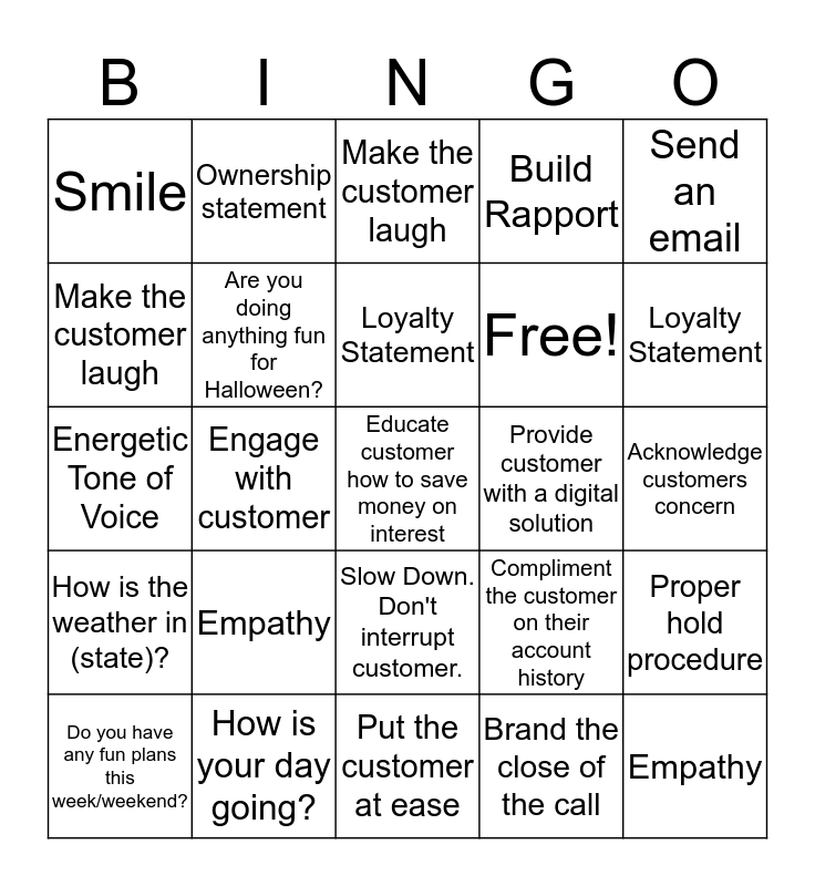 This bingo card has a free space and 24 words: Empathy, How is your day going?, Loyalty Statement, Do you have any fun plans this week/weekend?, Send an email, Smile, Make the customer laugh, Ownership statement, Provide customer with a digital solution, Slow Down. Don't interrupt customer., Free!, Energetic Tone of Voice, Compliment the customer on their account history, Proper hold procedure, Are you doing anything fun for Halloween?, Brand the close of the call, Acknowledge customers concern, Make the customer laugh, Loyalty Statement, Engage with customer, Empathy, How is the weather in (state)?, Build Rapport and Put the customer at ease.