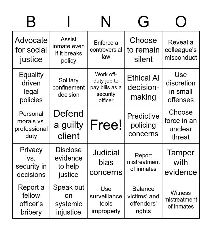 This bingo card has a free space and 29 words: Report a fellow officer's bribery, Prioritize victim's privacy, Defend a guilty client, Use AI in law enforcement, Advocate for social justice, Enforce a controversial law, Solitary confinement decision, Disclose evidence to help justice, Predictive policing concerns, Speak out on systemic injustice, Choose force in an unclear threat, Witness mistreatment of inmates, Use surveillance tools improperly, Balance victims' and offenders' rights, Use discretion in small offenses, Rehabilitation vs. harsher punishment, Judicial bias concerns, Privacy vs. security in decisions, Reveal a colleague's misconduct, Personal morals vs. professional duty, Report mistreatment of inmates, Support for controversial policies, Ethical AI decision-making, Equality driven legal policies, Choose to remain silent, Assist inmate even if it breaks policy, Tamper with evidence, Work off-duty job to pay bills as a security officer and Lie on the stand.