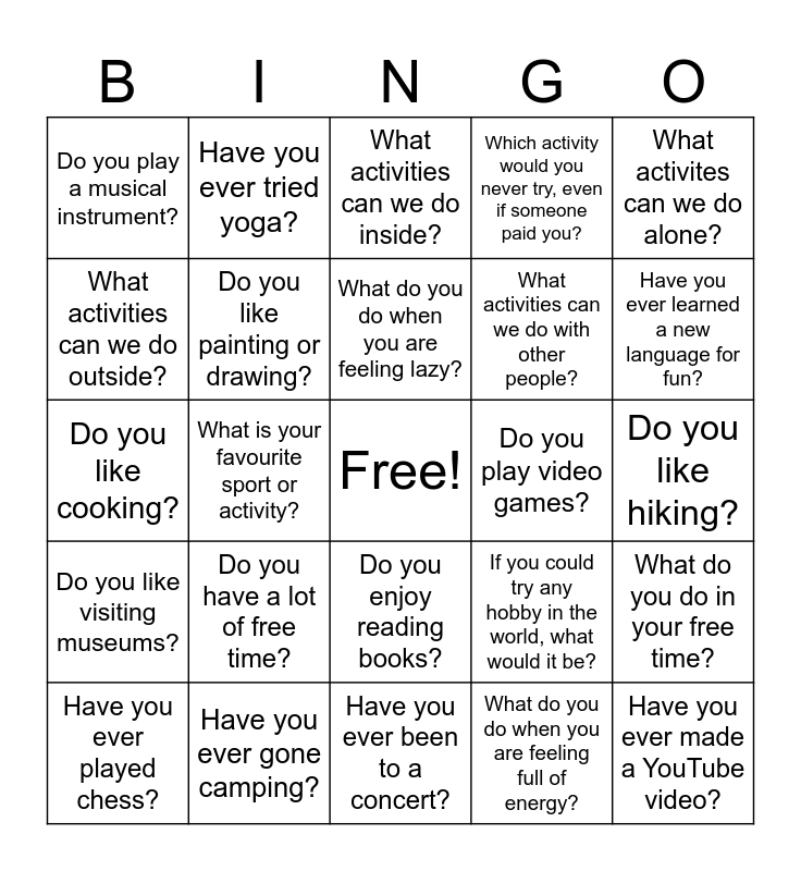 This bingo card has a free space and 24 words: Do you have a lot of free time?, Have you ever gone camping?, What do you do when you are feeling lazy?, Have you ever played chess?, What activites can we do alone?, Do you play a musical instrument?, What activities can we do outside?, Have you ever tried yoga?, Do you play video games?, Do you enjoy reading books?, What activities can we do with other people?, Do you like cooking?, If you could try any hobby in the world, what would it be?, What do you do in your free time?, Do you like painting or drawing?, What do you do when you are feeling full of energy?, Do you like hiking?, What activities can we do inside?, Have you ever learned a new language for fun?, What is your favourite sport or activity?, Have you ever made a YouTube video?, Do you like visiting museums?, Which activity would you never try, even if someone paid you? and Have you ever been to a concert?.