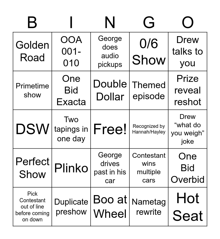 This bingo card has a free space and 25 words: Plinko, Boo at Wheel, Double Dollar, Pick Contestant out of line before coming on down, Drew talks to you, Golden Road, Primetime show, OOA 001-010, Recognized by Hannah/Hayley, George drives past in his car, Themed episode, DSW, Contestant wins multiple cars, One Bid Overbid, One Bid Exacta, Wheelie, Drew “what do you weigh” joke, George does audio pickups, Prize reveal reshot, Two tapings in one day, Hot Seat, Duplicate preshow, Perfect Show, 0/6 Show and Nametag rewrite.