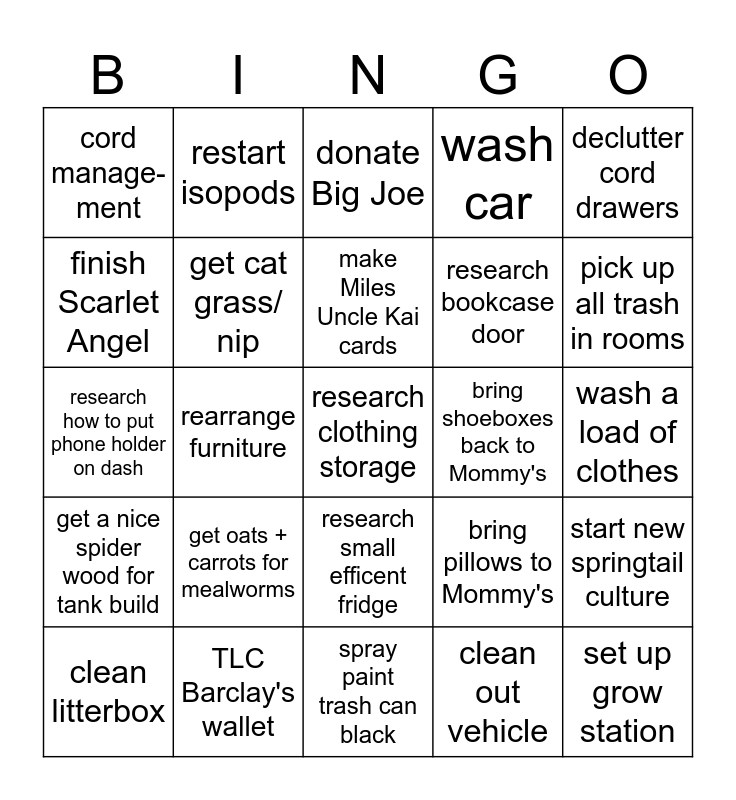 This bingo card has a free space and 24 words: get oats + carrots for mealworms, TLC Barclay's wallet, make Miles Uncle Kai cards, clean litterbox, declutter cord drawers, cord manage-ment, finish Scarlet Angel, restart isopods, bring shoeboxes back to Mommy's, research small efficent fridge, research bookcase door, research how to put phone holder on dash, bring pillows to Mommy's, start new springtail culture, get cat grass/ nip, clean out vehicle, wash a load of clothes, donate Big Joe, pick up all trash in rooms, rearrange furniture, set up grow station, get a nice spider wood for tank build, wash car and spray paint trash can black.