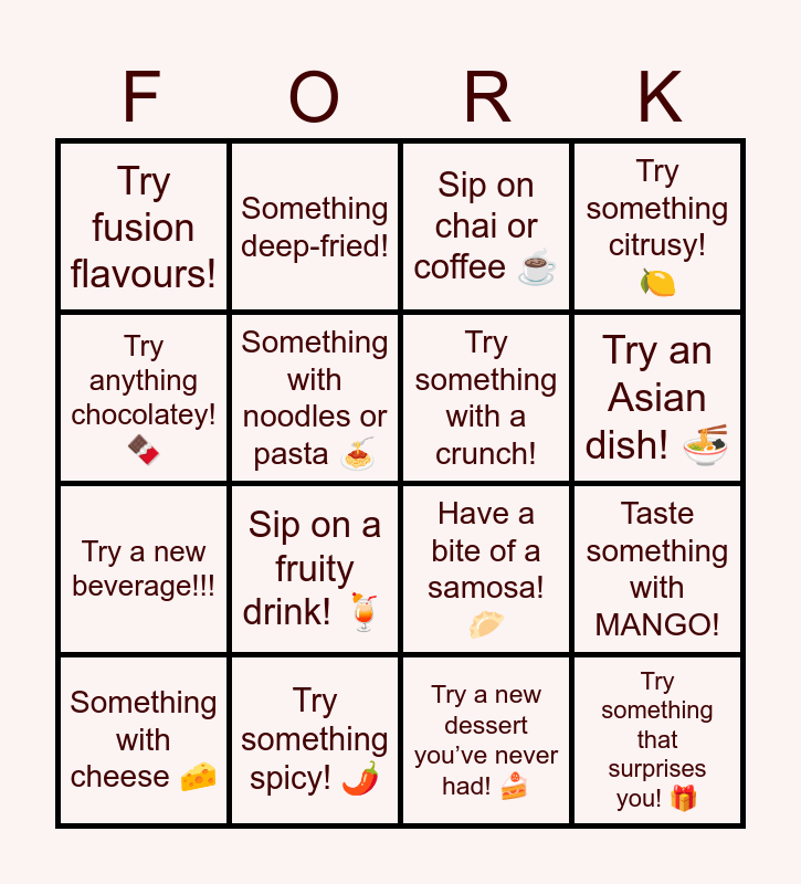 This bingo card has 16 words: Try something spicy! 🌶, Taste something with MANGO!, Sip on chai or coffee ☕, Try fusion flavours!, Try a new beverage!!!, Something deep-fried!, Have a bite of a samosa! 🥟, Try a new dessert you’ve never had! 🍰, Try anything chocolatey! 🍫, Something with noodles or pasta 🍝, Something with cheese 🧀, Try something citrusy! 🍋, Sip on a fruity drink! 🍹, Try an Asian dish! 🍜, Try something with a crunch! and Try something that surprises you! 🎁.