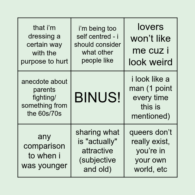 This bingo card has a free space and 8 words: i look like a man (1 point every time this is mentioned), lovers won’t like me cuz i look weird, i’m being too self centred - i should consider what other people like, any comparison to when i was younger, that i’m dressing a certain way with the purpose to hurt, queers don’t really exist, you’re in your own world, etc, anecdote about parents fighting/ something from the 60s/70s and sharing what is "actually" attractive (subjective and old).