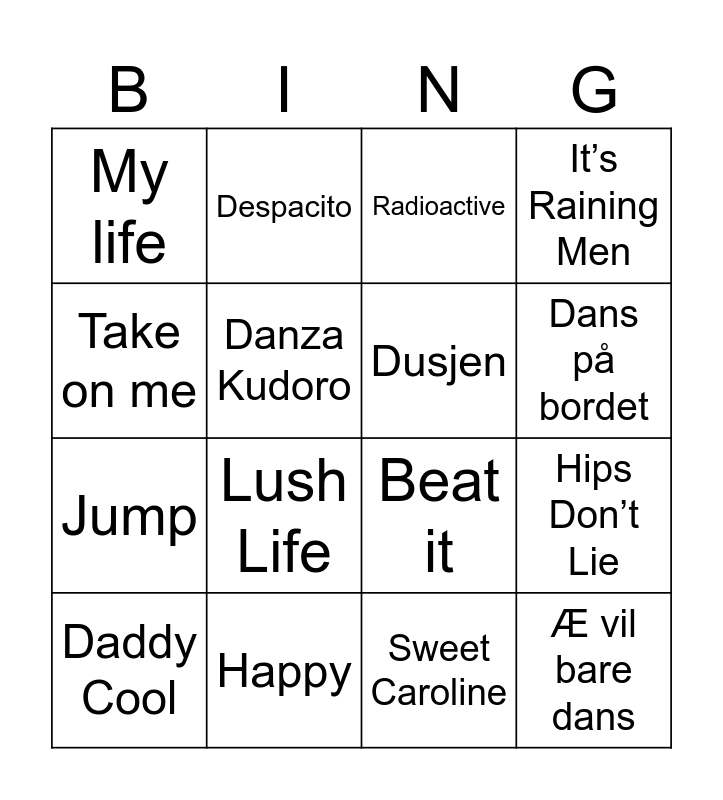 This bingo card has 42 words: Livin’ on a Prayer, Dans på bordet, Celebration, I Want You Back, What Is Love, I Wanna Dance With Somebody, Daddy Cool, Le Freak, Radioactive, Titanium, Sweet Caroline, Lush Life, Hips Don’t Lie, Take on me, Møkkamann, U Can`t Touch This, Born This Way, Beat it, House of the rising sun, Despacito, Danza Kudoro, All of me, Glow, My life, En godt stekt pizza, I'm Gonna Be (500 Miles), Jump, Boogie Wonderland, Bonski, Wake Me Up Before You Go-Go, Beggin’, Æ vil bare dans, Dusjen, Super Trouper, Shake It Off, How will I know, Hey Baby, Happy, Levva livet, It’s My Life, It’s Raining Men and I wanna dance with somebody.
