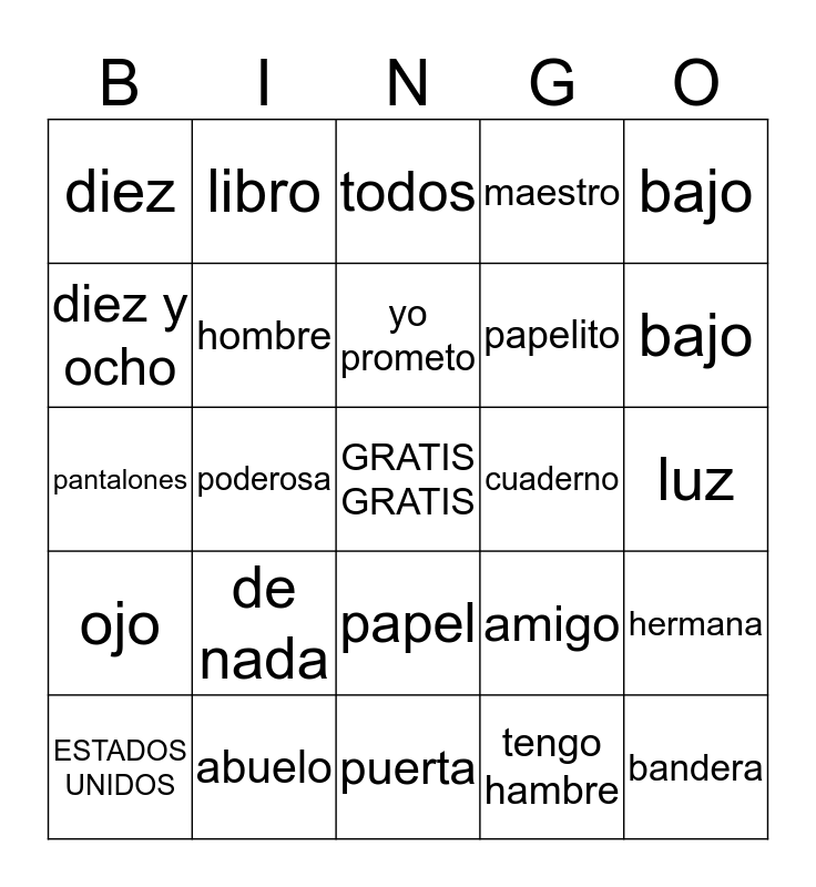This bingo card has a free space and 24 words: de nada, abuelo, yo prometo, ESTADOS UNIDOS, bajo, diez, diez y ocho, libro, cuaderno, papel, papelito, pantalones, amigo, hermana, hombre, tengo hambre, luz, todos, bajo, poderosa, bandera, ojo, maestro and puerta.