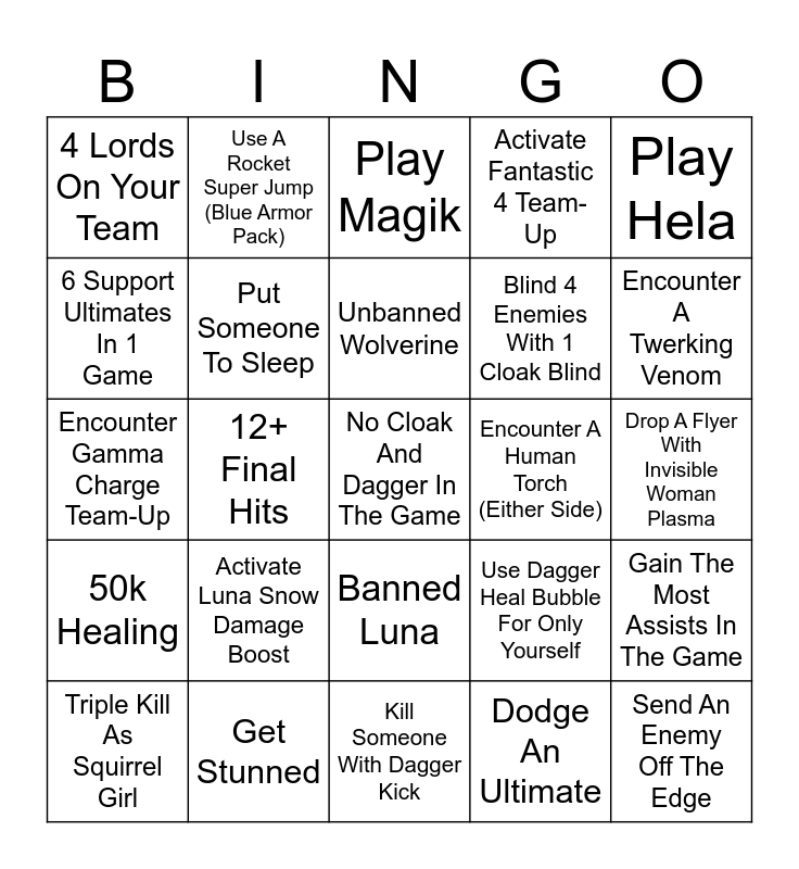 This bingo card has a free space and 24 words: Triple Kill As Squirrel Girl, Activate Luna Snow Damage Boost, Unbanned Wolverine, Dodge An Ultimate, Play Hela, 4 Lords On Your Team, Use A Rocket Super Jump (Blue Armor Pack), Play Magik, Encounter A Human Torch (Either Side), Drop A Flyer With Invisible Woman Plasma, Encounter Gamma Charge Team-Up, Put Someone To Sleep, Use Dagger Heal Bubble For Only Yourself, Gain The Most Assists In The Game, 6 Support Ultimates In 1 Game, Get Stunned, Kill Someone With Dagger Kick, Activate Fantastic 4 Team-Up, Encounter A Twerking Venom, 50k Healing, 12+ Final Hits, Banned Luna, Blind 4 Enemies With 1 Cloak Blind and Send An Enemy Off The Edge.