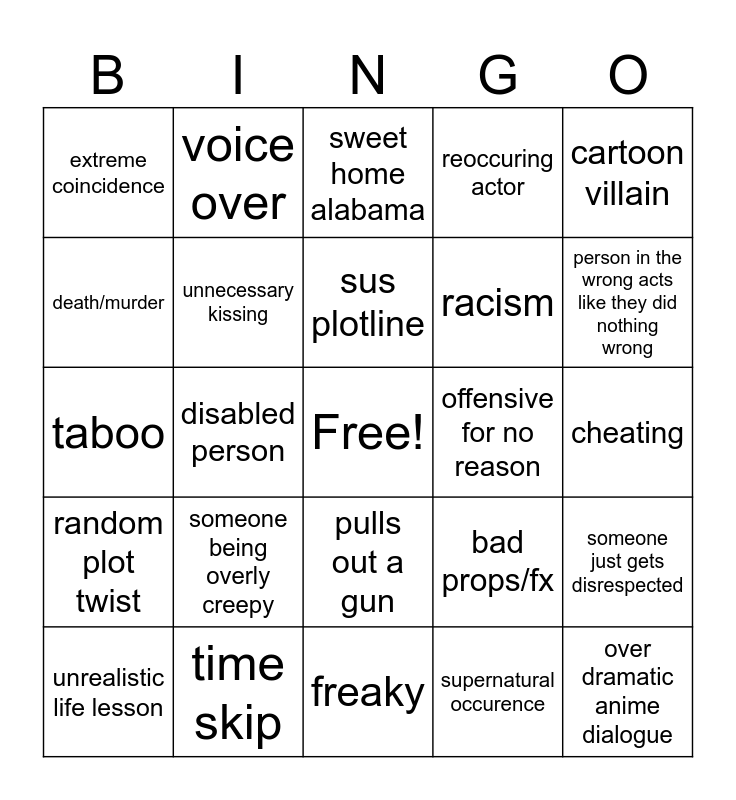 This bingo card has a free space and 24 words: someone being overly creepy, time skip, sus plotline, unrealistic life lesson, cartoon villain, extreme coincidence, death/murder, voice over, offensive for no reason, pulls out a gun, racism, taboo, bad props/fx, someone just gets disrespected, unnecessary kissing, supernatural occurence, cheating, sweet home alabama, person in the wrong acts like they did nothing wrong, disabled person, over dramatic anime dialogue, random plot twist, reoccuring actor and freaky.