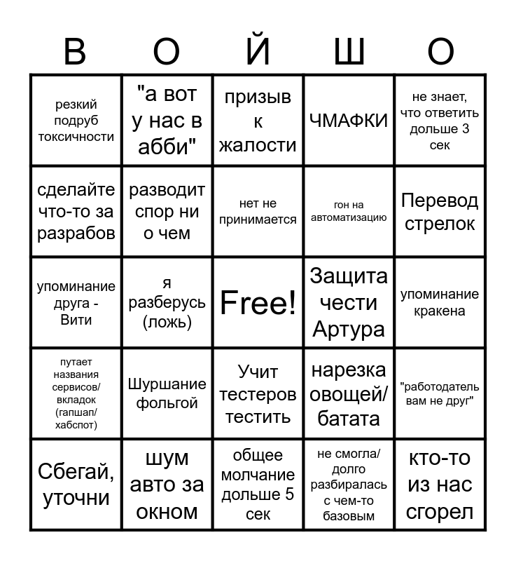 This bingo card has a free space and 24 words: Сбегай, уточни, Шуршание фольгой, нет не принимается, не смогла/долго разбиралась с чем-то базовым, не знает, что ответить дольше 3 сек, резкий подруб токсичности, "а вот у нас в абби", призыв к жалости, Защита чести Артура, упоминание кракена, упоминание друга - Вити, разводит спор ни о чем, нарезка овощей/батата, "работодатель вам не друг", сделайте что-то за разрабов, шум авто за окном, общее молчание дольше 5 сек, ЧМАФКИ, Перевод стрелок, путает названия сервисов/вкладок (гапшап/хабспот), я разберусь (ложь), Учит тестеров тестить, гон на автоматизацию and кто-то из нас сгорел.