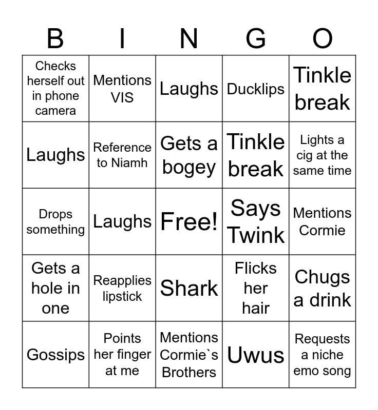 This bingo card has a free space and 24 words: Reapplies lipstick, Points her finger at me, Gets a bogey, Gossips, Tinkle break, Checks herself out in phone camera, Laughs, Mentions VIS, Says Twink, Shark, Tinkle break, Drops something, Flicks her hair, Chugs a drink, Reference to Niamh, Uwus, Mentions Cormie, Laughs, Lights a cig at the same time, Laughs, Requests a niche emo song, Gets a hole in one, Ducklips and Mentions Cormie`s Brothers.