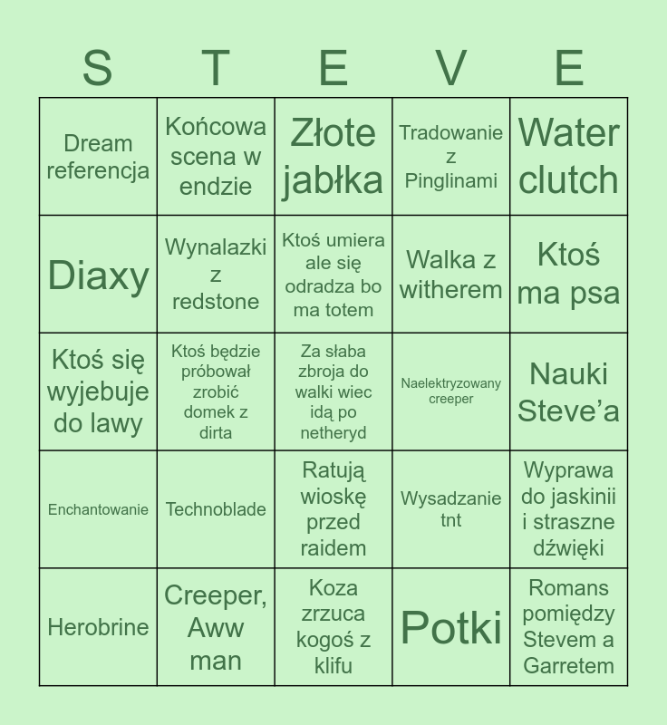 This bingo card has a free space and 24 words: Technoblade, Creeper, Aww man, Ktoś umiera ale się odradza bo ma totem, Herobrine, Water clutch, Dream referencja, Diaxy, Końcowa scena w endzie, Naelektryzowany creeper, Ratują wioskę przed raidem, Walka z witherem, Ktoś się wyjebuje do lawy, Wysadzanie tnt, Wyprawa do jaskinii i straszne dźwięki, Wynalazki z redstone, Potki, Nauki Steve’a, Złote jabłka, Ktoś ma psa, Ktoś będzie próbował zrobić domek z dirta, Romans pomiędzy Stevem a Garretem, Enchantowanie, Tradowanie z Pinglinami and Koza zrzuca kogoś z klifu.