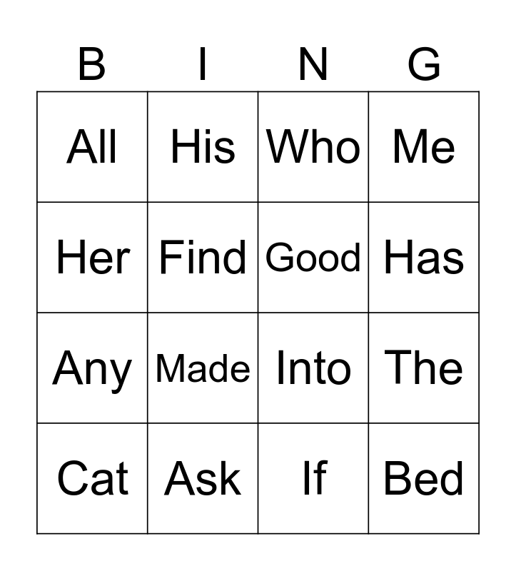 This bingo card has 16 words: Ask, The, Who, All, Any, His, Into, If, Her, Find, Cat, Me, Made, Has, Good and Bed.