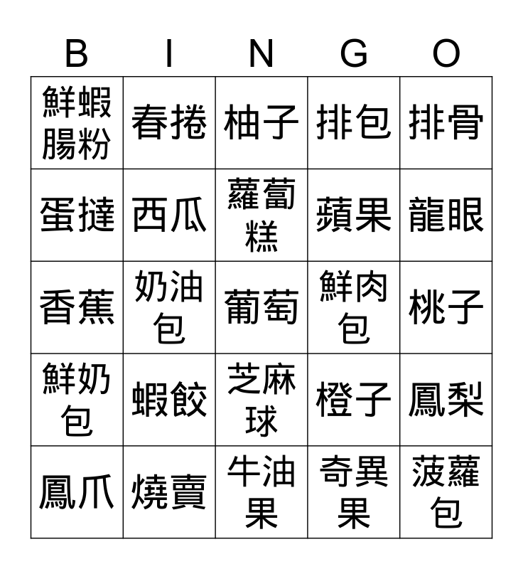 食物BINGO! | 食物BINGO! | 好運bingo | Dim Sum Bingo | 小吃