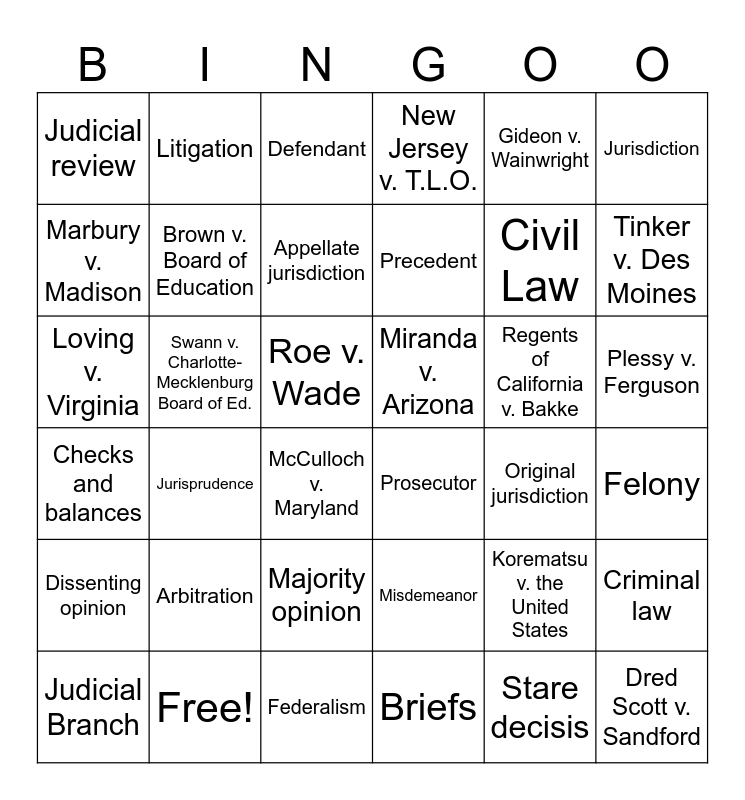This bingo card has 39 words: Free!, Judicial Branch, Supreme Court, Marbury v. Madison, McCulloch v. Maryland, Plessy v. Ferguson, Brown v. Board of Education, Dred Scott v. Sandford, Gideon v. Wainwright, Miranda v. Arizona, Tinker v. Des Moines, New Jersey v. T.L.O., Loving v. Virginia, Roe v. Wade, Swann v. Charlotte-Mecklenburg Board of Ed., Regents of California v. Bakke, Korematsu v. the United States, Judicial review, Federalism, Checks and balances, Jurisdiction, Original jurisdiction, Appellate jurisdiction, Precedent, Briefs, Majority opinion, Dissenting opinion, Stare decisis, Arbitration, Litigation, Mediation, Criminal law, Defendant, Prosecutor, Felony, Misdemeanor, Jurisprudence, Civil Law and Code of Hammurabi.