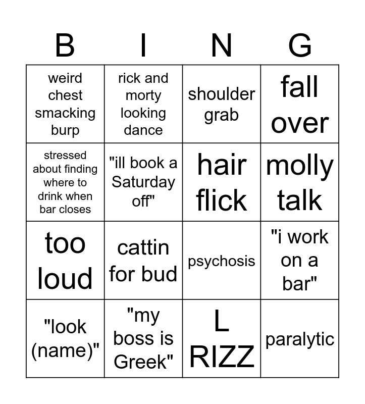 This bingo card has 16 words: "my boss is Greek", "i work on a bar", shoulder grab, weird chest smacking burp, too loud, rick and morty looking dance, psychosis, L RIZZ, stressed about finding where to drink when bar closes, "ill book a Saturday off", "look (name)", fall over, cattin for bud, molly talk, hair flick and paralytic.