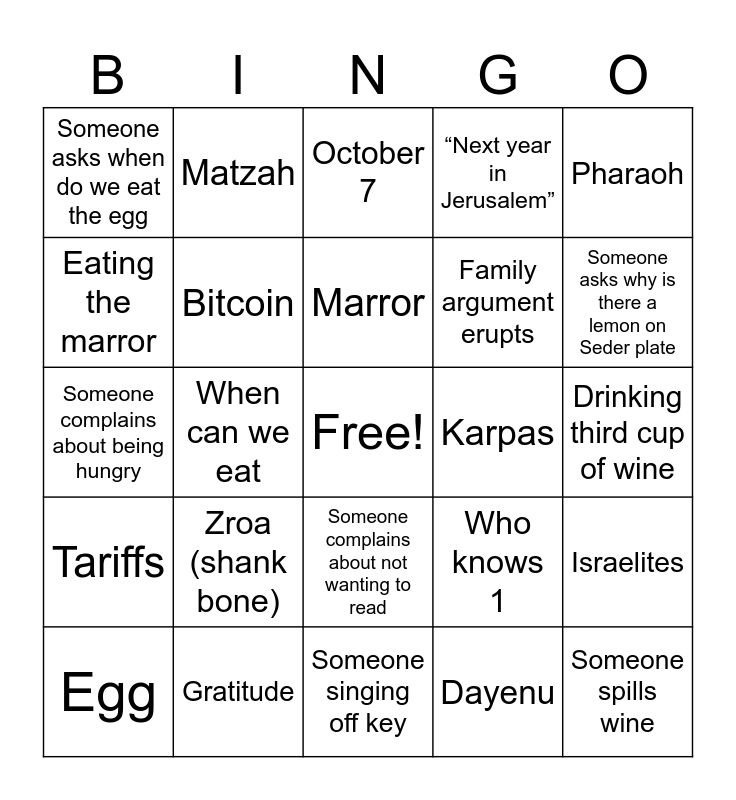 This bingo card has a free space and 32 words: Dayenu, The Nile, When can we eat, Someone asks “Does this have nuts in it”, Tariffs, Bitcoin, Pharaoh, Israelites, Matzah, Charoset, Marror, October 7, First born, Ma nishtana, Karpas, Moses, Egg, Someone complains about being hungry, Someone complains about not wanting to read, Zroa (shank bone), Who knows 1, Trump, Drinking third cup of wine, Gratitude, Someone spills wine, “Next year in Jerusalem”, Family argument erupts, Eating the marror, Someone asks when do we eat the egg, Someone singing off key, Someone accuses another of being the wicked son and Someone asks why is there a lemon on Seder plate.