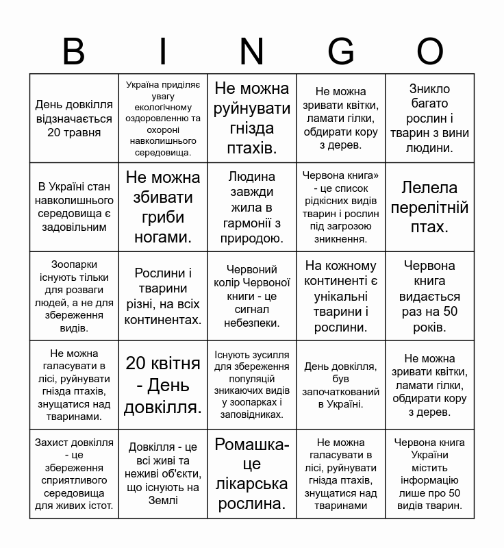 This bingo card has a free space and 24 words: 20 квітня - День довкілля., Довкілля - це всі живі та неживі об'єкти, що існують на Землі, Людина завжди жила в гармонії з природою., Захист довкілля - це збереження сприятливого середовища для живих істот., Зникло багато рослин і тварин з вини людини., День довкілля відзначається 20 травня, В Україні стан навколишнього середовища є задовільним, Україна приділяє увагу екологічному оздоровленню та охороні навколишнього середовища., На кожному континенті є унікальні тварини і рослини., Існують зусилля для збереження популяцій зникаючих видів у зоопарках і заповідниках., Червона книга» - це список рідкісних видів тварин і рослин під загрозою зникнення., Зоопарки існують тільки для розваги людей, а не для збереження видів., День довкілля, був започаткований в Україні., Не можна зривати квітки, ламати гілки, обдирати кору з дерев., Не можна збивати гриби ногами., Не можна галасувати в лісі, руйнувати гнізда птахів, знущатися над тваринами, Червона книга видається раз на 50 років., Не можна руйнувати гнізда птахів., Лелела перелітній птах., Рослини і тварини різні, на всіх континентах., Червона книга України містить інформацію лише про 50 видів тварин., Не можна галасувати в лісі, руйнувати гнізда птахів, знущатися над тваринами., Не можна зривати квітки, ламати гілки, обдирати кору з дерев. and Ромашка- це лікарська рослина..
