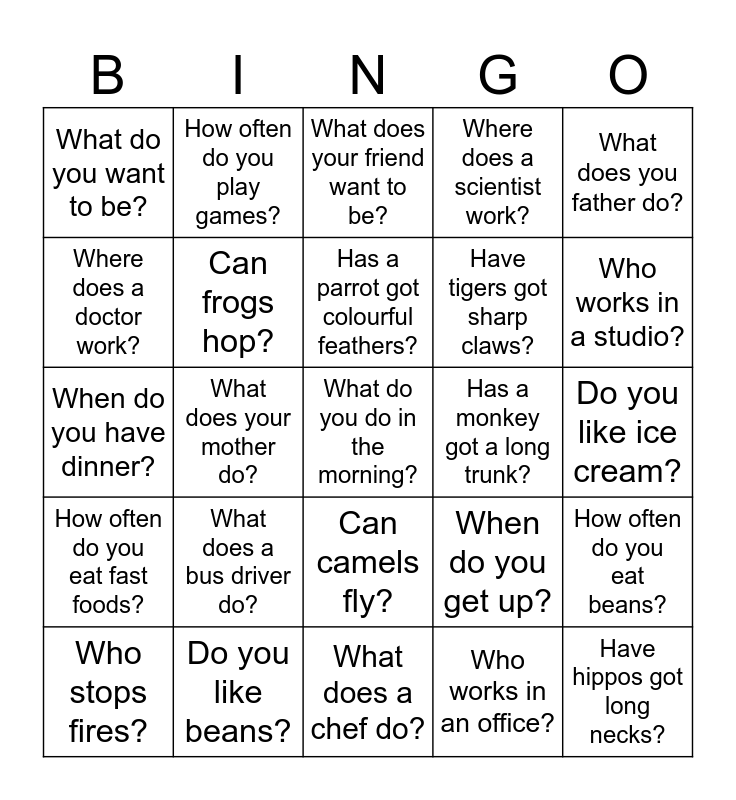 This bingo card has a free space and 24 words: What does a bus driver do?, Do you like beans?, Has a parrot got colourful feathers?, Who stops fires?, What does you father do?, What do you want to be?, Where does a doctor work?, How often do you play games?, Has a monkey got a long trunk?, Can camels fly?, Have tigers got sharp claws?, When do you have dinner?, When do you get up?, How often do you eat beans?, Can frogs hop?, Who works in an office?, Do you like ice cream?, What does your friend want to be?, Who works in a studio?, What does your mother do?, Have hippos got long necks?, How often do you eat fast foods?, Where does a scientist work? and What does a chef do?.