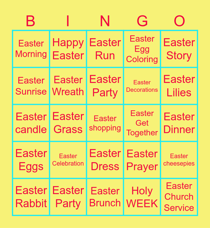 This bingo card has a free space and 39 words: Easter Flowers, Easter Card, Easter Chocolat, Easter Wreath, Easter Rabbit, Easter Dress, Easter Party, Easter Parade, Easter Story, Easter Eggs, Easter Grass, Easter Egg Coloring, Easter Church Service, Easter Dinner, Easter Get Together, Easter Celebration, Easter Breakfast, Easter Morning, Easter Tradition, Easter Prayer, Easter Sunrise, Easter Brunch, Easter Decorations, Easter Lilies, Easter Bunnies, Easter Ham, Easter Basket, Easter Candy, Easter Card, Happy Easter, Easter Fun, Easter, Easter Run, Easter Party, Holy WEEK, RESURECTION, Easter cheesepies, Easter candle and Holy light.
