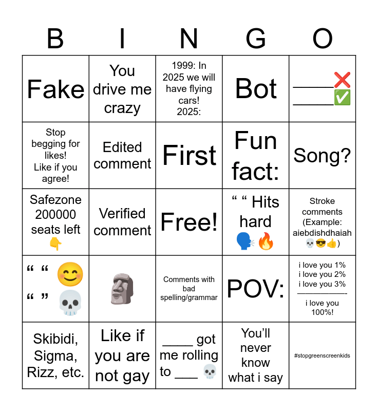 This bingo card has a free space and 39 words: Edit:, Like beggars, This is [NAME] One like = One age, Edited comment, Skibidi, Sigma, Rizz, etc., Comments with bad spelling/grammar, First, π, _____β _____β , β β π β β π, Verified comment, Bot, #stopgreenscreenkids, Stroke comments (Example: aiebdishdhaiah πππ), β β Hits hard π£οΈπ₯, πΏ, Comment with a swear word, Fake, Comments with the quote in the video, POV:, Stop begging for likes! Like if you agree!, ____ got me rolling to ___ π, Fun fact:, Song?, Team ____ π, Whoβs with me?, For those who donβt know:, Comment with βkidβ, Easy π (usually found in challenge videos), You drive me crazy, You dropped this π Can i have it?, Welcome to the cap store, 1999: In 2025 we will have flying cars! 2025:, Like if you are not gay, Youβll never know what i say, Respect to the guy who respected the guy who respected the guy who said _____, i love you 1% i love you 2% i love you 3% ββββββ- i love you 100%!, Safezone 200000 seats left π and People who saw _____ π.