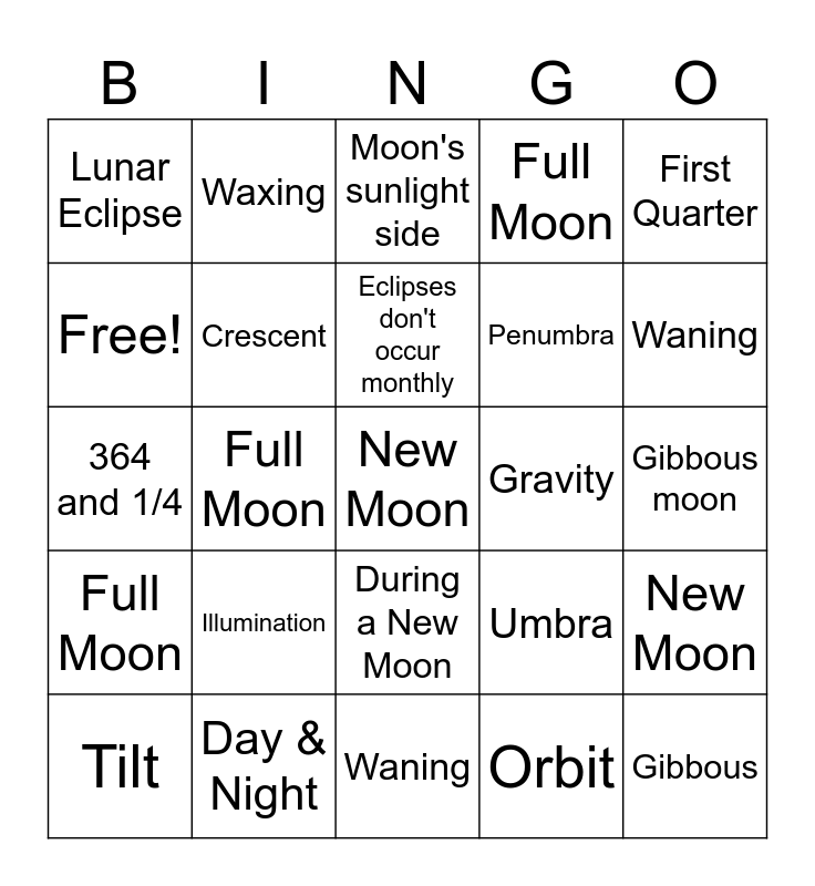 This bingo card has a free space and 40 words: 29.5 days or 1 month, 364 and 1/4, Axis, Crescent, Day & Night, During a New Moon, Eclipses don't occur monthly, Equator, First Quarter, Full Moon, Full Moon, Full Moon, Gibbous, Gibbous moon, Gravity, Illumination, Left side, Lunar Eclipse, Moon Phases, Moon's sunlight side, New Moon, Orbit, Penumbra, Free!, Phase, revolution around Earth, Right side, Shadow, Solar Eclipse, Spring Tides, Third Quarter, Tilt, Tilted, Umbra, Waning, Waning, Waning Crescent, Waning Gibbous, Waxing and Waxing.