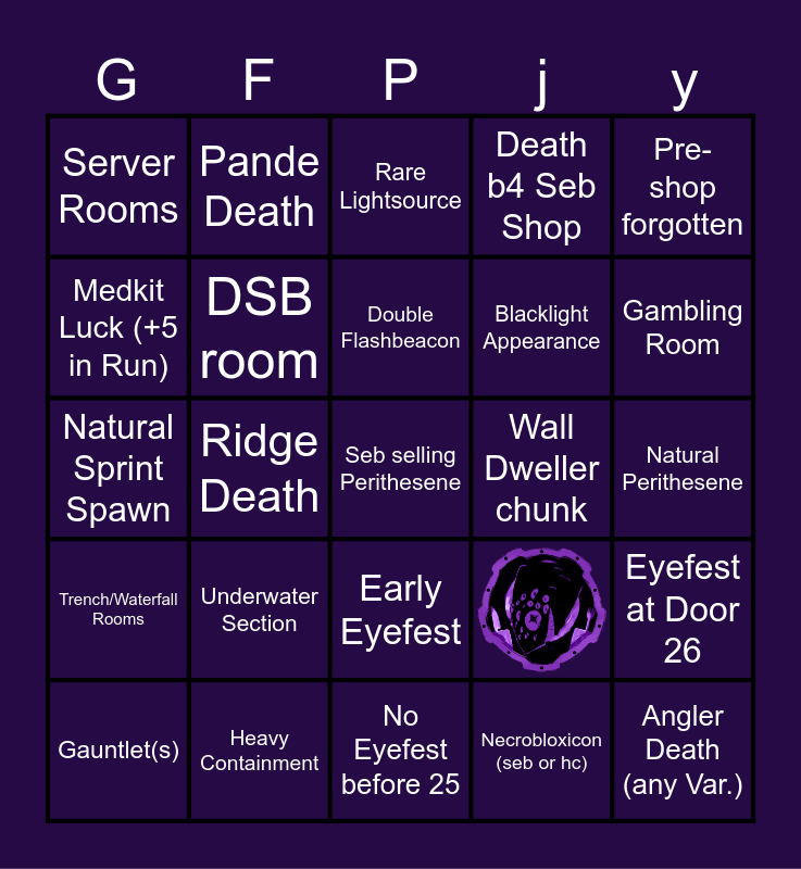 This bingo card has 1 images and 24 words: Underwater Section, No Eyefest before 25, Double Flashbeacon, Gauntlet(s), Pre-shop forgotten, Server Rooms, Medkit Luck (+5 in Run), Pande Death, Wall Dweller chunk, Early Eyefest, Blacklight Appearance, Natural Sprint Spawn, Eyefest at Door 26, DSB room, Angler Death (any Var.), Natural Perithesene, Rare Lightsource, Gambling Room, Ridge Death, Seb selling Perithesene, Heavy Containment, Trench/Waterfall Rooms, Death b4 Seb Shop and Necrobloxicon (seb or hc).