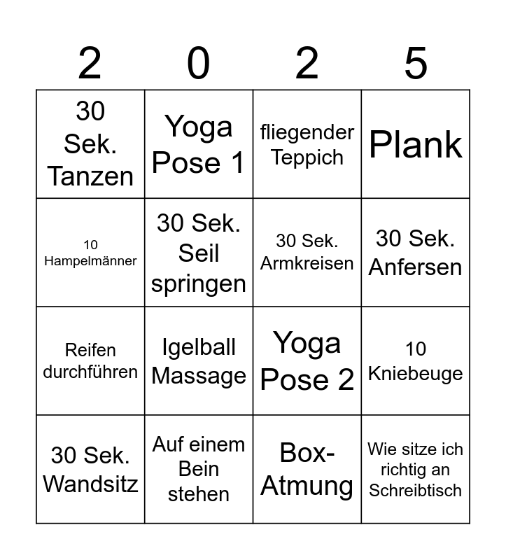 This bingo card has 16 words: Auf einem Bein stehen, 10 Kniebeuge, fliegender Teppich, 30 Sek. Tanzen, Reifen durchführen, Yoga Pose 1, Yoga Pose 2, Box-Atmung, 10 Hampelmänner, 30 Sek. Seil springen, 30 Sek. Wandsitz, Plank, Igelball Massage, 30 Sek. Anfersen, 30 Sek. Armkreisen and Wie sitze ich richtig an Schreibtisch.