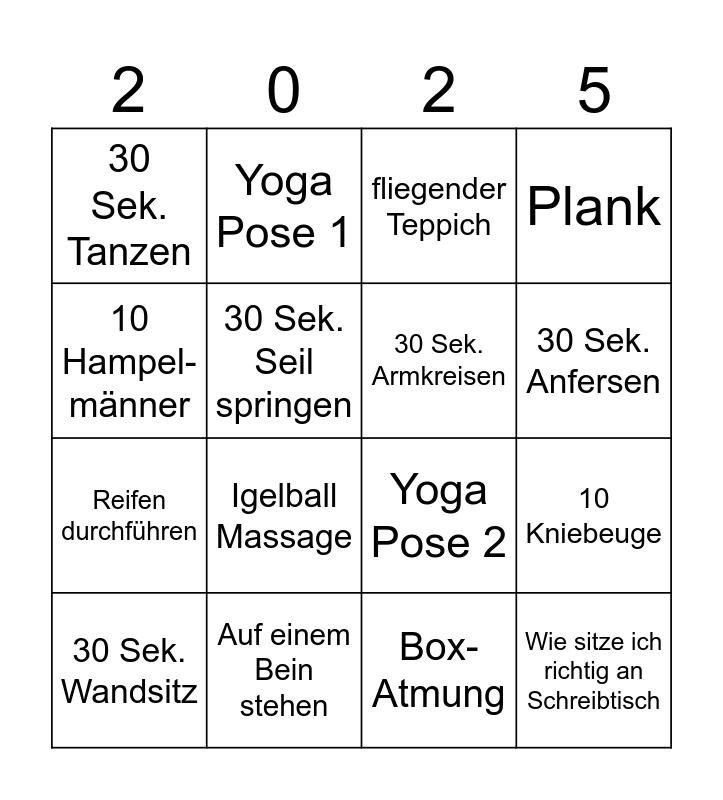 This bingo card has 16 words: Auf einem Bein stehen, 10 Kniebeuge, fliegender Teppich, 30 Sek. Tanzen, Reifen durchführen, Yoga Pose 1, Yoga Pose 2, Box-Atmung, 10 Hampel-männer, 30 Sek. Seil springen, 30 Sek. Wandsitz, Plank, Igelball Massage, 30 Sek. Anfersen, 30 Sek. Armkreisen and Wie sitze ich richtig an Schreibtisch.
