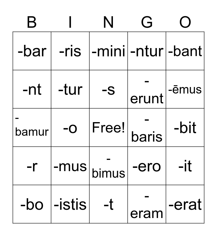 This bingo card has a free space and 24 words: -mus, -istis, -s, -bo, -bant, -bar, -nt, -ris, -baris, -bimus, -erunt, -bamur, -ero, -it, -tur, -eram, -bit, -mini, -ēmus, -o, -erat, -r, -ntur and -t.
